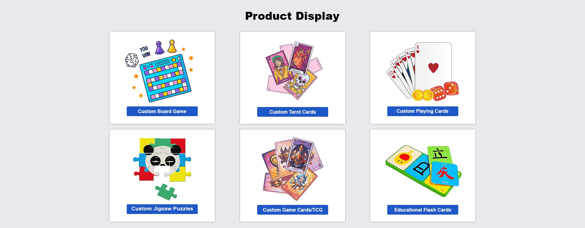 Productos principales:Juego de mesa personalizado, naipes personalizados, cartas de Tarot personalizadas, tarjetas Flash personalizadas, rompecabezas personalizados